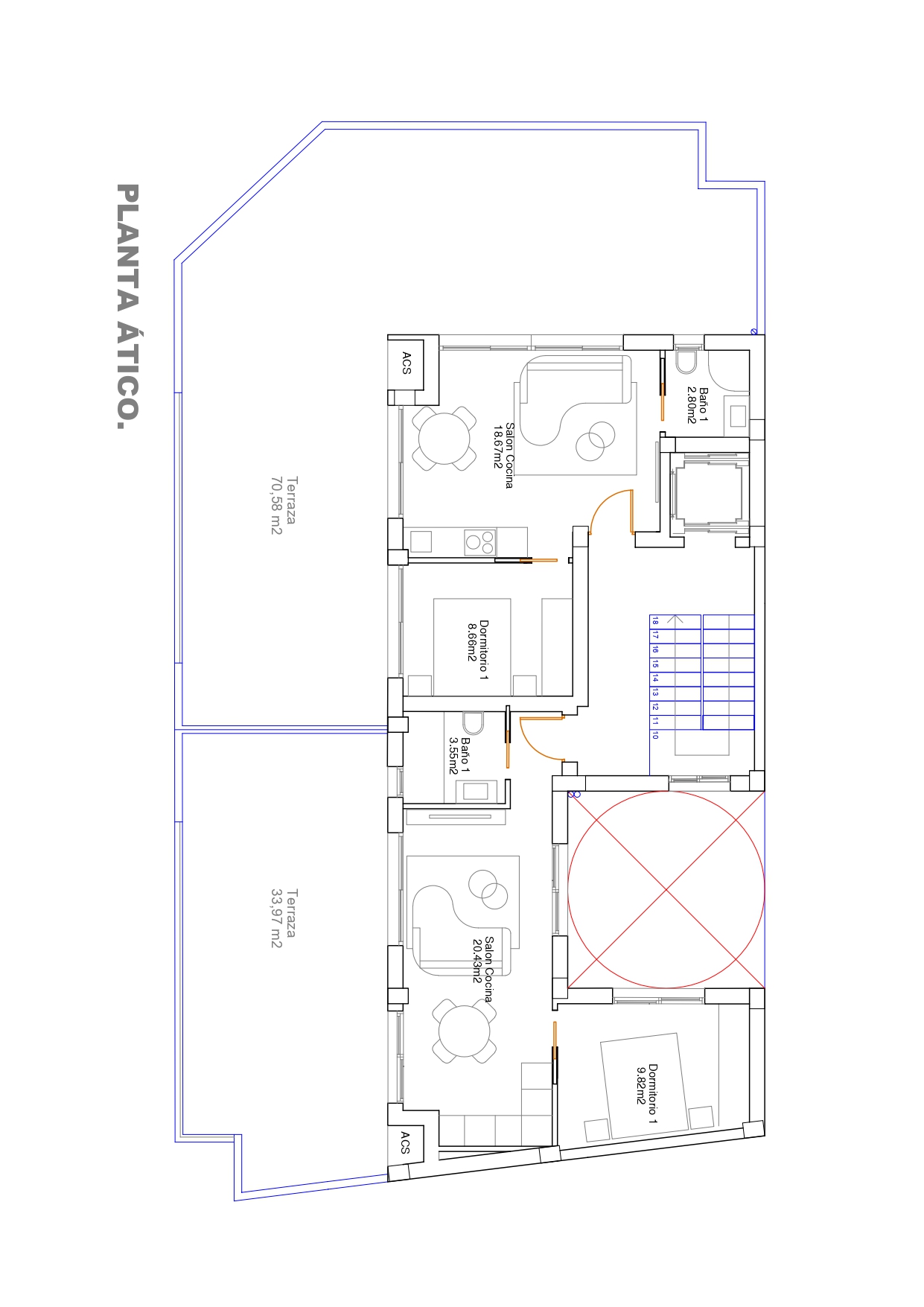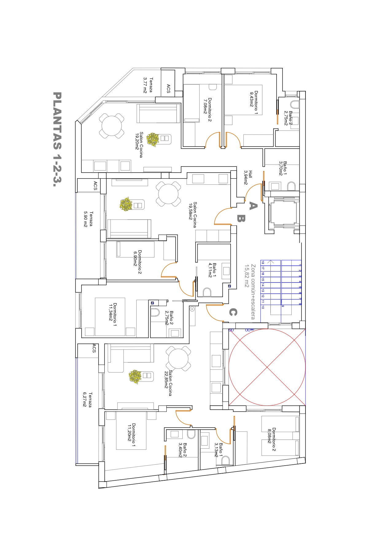 Escalera y ascensor que conecta desde planta baja hasta cubierta común.