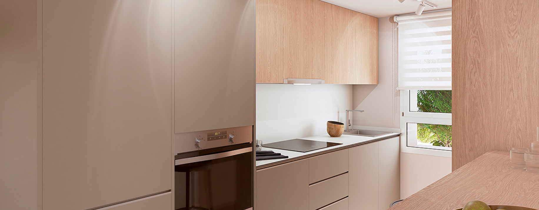 - Кухни интегрированы в гостиную, полностью оборудованы варочной панелью, духовкой и холодильником.